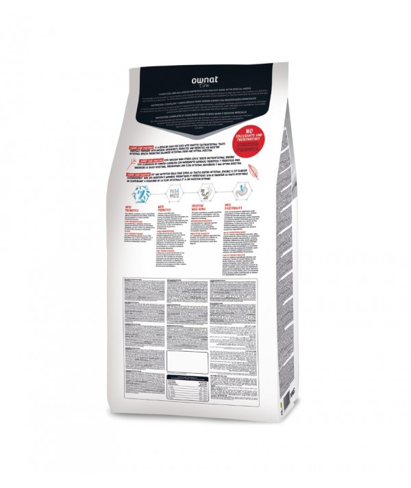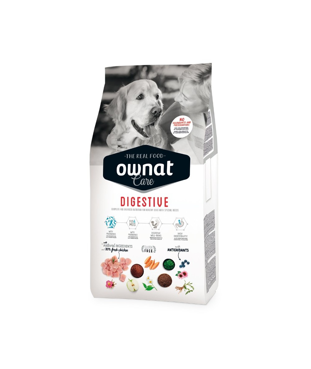OWNAT CARE DIGESTIVE está indicado para perros con el tracto gastrointestinal sensible. Está elaborado de manera cuidadosa con ingredientes naturales, probióticos y prebióticos para favorecer la salud intestinal, promoviendo una flora intestinal equilibrada y una óptima digestión.