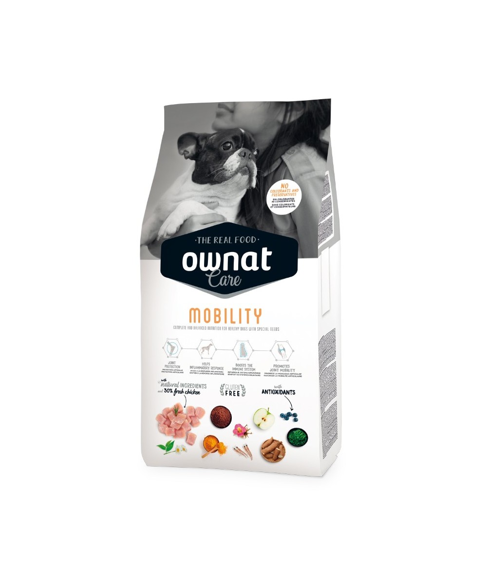 OWNAT CARE MOBILITY es un alimento completo y equilibrado para perros tanto en la fase de crecimiento como adultos y seniors, con articulaciones delicadas. Con un contenido moderado de calorías para evitar el incremento de peso y con ingredientes funcionales para la mejora de la salud articular.