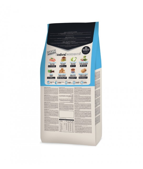 Carnes 39% (carnes deshidratadas 29%, pollo fresco* 10% antes de la extrusión), arroz integral* (12%), trigo integral* (9%), grasa de pollo, maíz integral* (8%), salvado de trigo* (8%), cebada integral* (7%), guisantes enteros* (2%), manzana* (1%), aceite de salmón, semilla de lino* (1%), pulpa de remolacha, fructo y manano oligosacáridos, levadura de cerveza* (0,5%), plantes aromáticas 0,02% (hinojo*, equinácea*, tomillo*), yucca schidigera. *INGREDIENTES NATURALES