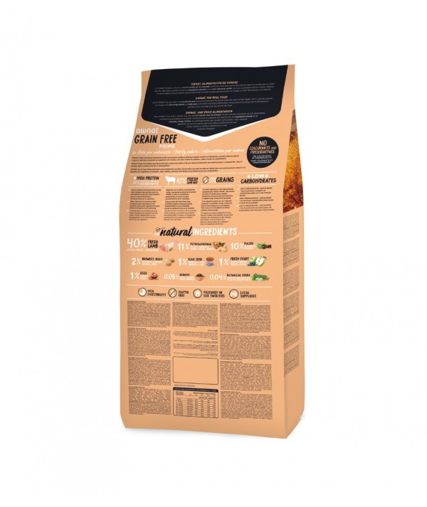 Cordero fresco* (min. 40% antes de la extrusión), cerdo deshidratado (15%), guisantes enteros* (8%), grasa animal (preservada con antioxidantes naturales), cordero deshidratado (6%), raíces de mandioca* (6%), pescados deshidratados 5% (anchoveta, jurel y caballa), patata deshidratada* (5%), levadura de cerveza* (2%), vaina de algarroba* (2%), pulpa de remolacha, semilla de lino* (1%), huevo deshidratado* (1%), manzana* (1%), alfalfa deshidratada*, aceite de pescado (preservado con antioxidantes naturales), sal gema*, fructo y manano oligosacáridos, algas marinas deshidratadas* (500 mg/kg), glucosamina (500 mg/kg), yucca schidigera, condroitín sulfato (100 mg/kg), arándanos* (100 mg/kg), tomillo* (80 mg/kg), flor de manzanilla* (80 mg/kg), hinojo* (80 mg/kg), equinácea* (80 mg/kg), té verde* (80 mg/kg). *INGREDIENTES NATURALES