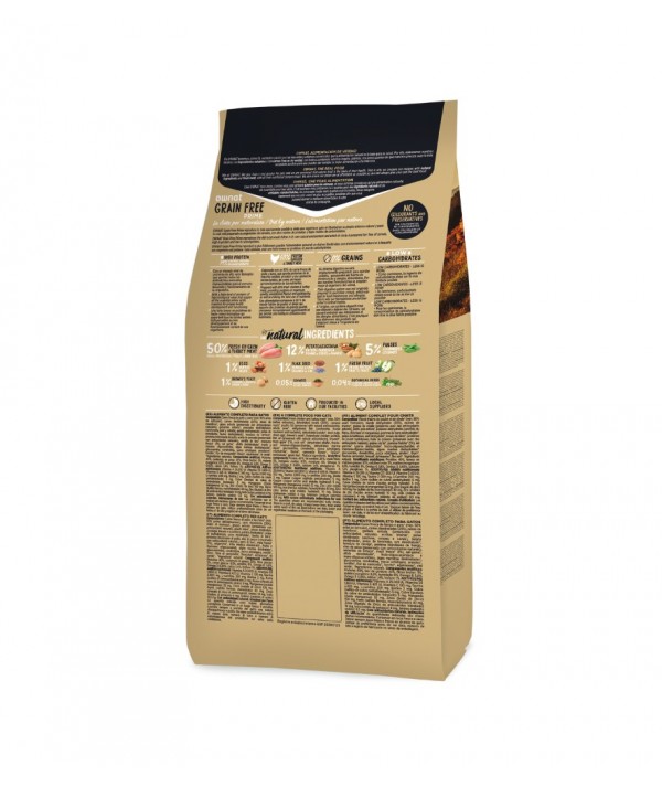 Pollo fresco* (mín. 25% antes de la extrusión), pavo fresco* (mín. 25% antes de la extrusión), pollo deshidratado (13%), raíces de mandioca* (8%), cerdo deshidratado (7%), grasa avícola (preservada con antioxidantes naturales), guisantes enteros* (5%), pescados deshidratados (anchoveta, jurel y caballa), patata deshidratada* (4%), pulpa de remolacha, huevo deshidratado* (1%), levadura de cerveza* (1%), proteína hidrolizada de pollo, aceite de pescado (preservado con antioxidantes naturales), semilla de lino* (1%), manzana* (1%), sal gema*, alfalfa deshidratada*, fructo y manano oligosacáridos, algas marinas deshidratadas* (500 mg/kg), glucosamina (500 mg/kg), yucca schidigera, condroitín sulfato (100 mg/kg), arándanos* (100 mg/kg), tomillo* (80 mg/kg), flor de manzanilla* (80 mg/kg), hinojo* (80 mg/kg), equinácea* (80 mg/kg), té verde* (80 mg/kg). *INGREDIENTES NATURALES