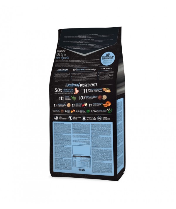 Pollo fresco* (15% mín. antes de la cocción), pavo fresco* (15% mín. antes de la cocción), pollo deshidratado (11%), cerdo deshidratado (10%), guisantes enteros* (9%), patata deshidratada* (7%), arroz integral* (7%), grasa de pollo (preservada con antioxidantes naturales), raíces de mandioca* (4%), cebada integral* (3%), habas enteras* (2%), salmón deshidratado (2%), proteína hidrolizada de pollo (2%), verduras y frutas frescas antes de la cocción (manzana* 1%, zanahoria* 0,5%, calabaza* 0,5%), levadura de cerveza* (1%), semilla de lino* (1%), huevo deshidratado* (1%), aceite de salmón (preservado con antioxidantes naturales), sal gema*, raíces de achicoria (FOS)*, extracto de levaduras (MOS), algas marinas deshidratadas* (500 mg/kg), glucosamina (500 mg/kg), yucca schidigera, condroitín sulfato (100 mg/kg), arándanos* (100 mg/kg), té verde* (80 mg/kg), equinácea* (80 mg/kg), flor de manzanilla* (80 mg/kg), hinojo* (80 mg/kg). *INGREDIENTES NATURALES