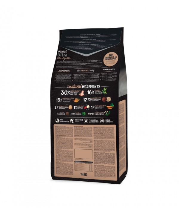 Pavo fresco* (30% mín. antes de la cocción), pollo deshidratado (12%), guisantes enteros* (11%), batata deshidratada* (10%), arroz integral* (7%), cerdo deshidratado (6%), avena integral* (5%), vaina de algarroba* (5%), raíces de mandioca* (3%), proteína hidrolizada de pollo (2,5%), pulpa de remolacha, levadura de cerveza* (2%), verduras y frutas frescas antes de la cocción (manzana* 1%, zanahoria* 0,5%, brócoli* 0,5%), semilla de lino* (1%), aceite de salmón (preservado con antioxidantes naturales), sal gema*, alfalfa deshidratada*, raíces de achicoria (FOS)*, extracto de levaduras (MOS), algas marinas deshidratadas* (500 mg/kg), glucosamina (500 mg/kg), yucca schidigera, condroitín sulfato (100 mg/kg), arándanos* (100 mg/kg), té verde* (100 mg/kg), equinácea* (100 mg/kg), flor de manzanilla* (100 mg/kg). *INGREDIENTES NATURALES