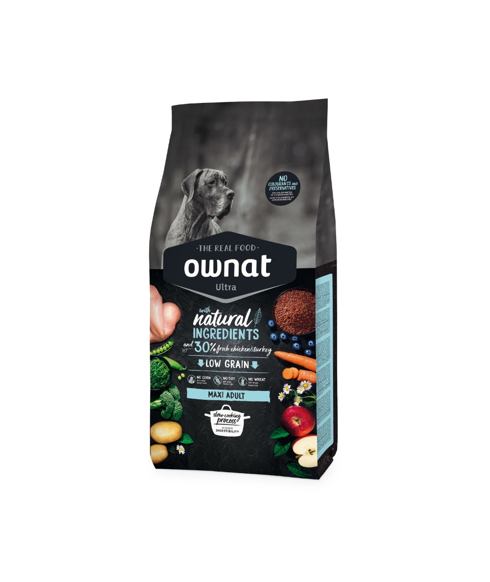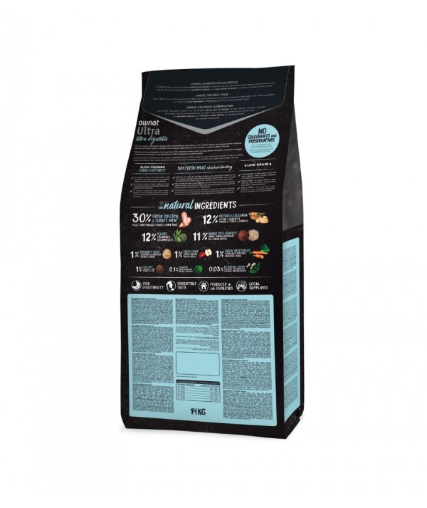 Pollo deshidratado (18%), pollo fresco* (15% mín. antes de la cocción), pavo fresco* (15% mín. antes de la cocción), raíces de mandioca* (8%), guisantes enteros* (7%), arroz integral* (7%), grasa de pollo (preservada con antioxidantes naturales), habas enteras* (4%), cebada integral* (4%), patata deshidratada* (4%), proteína hidrolizada de pollo (2,5%), verduras y frutas frescas antes de la cocción (manzana* 1%, zanahoria* 0,5%, brócoli* 0,5%), cerdo deshidratado (2%), levadura de cerveza* (1%), pulpa de remolacha, vaina de algarroba* (1%), aceite de salmón (preservado con antioxidantes naturales), semilla de lino* (1%), sal gema*, alfalfa deshidratada*, raíces de achicoria (FOS)*, extracto de levaduras (MOS), algas marinas deshidratadas* (500 mg/kg), glucosamina (500 mg/kg), yucca schidigera, condroitín sulfato (100 mg/kg), arándanos* (100 mg/kg), té verde* (100 mg/kg), equinácea* (100 mg/kg), flor de manzanilla* (100 mg/kg). *INGREDIENTES NATURALES